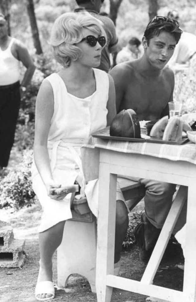 شيرلى ماكلين و آلان ديلون خلف الكاميرا يتناولان الطعام.