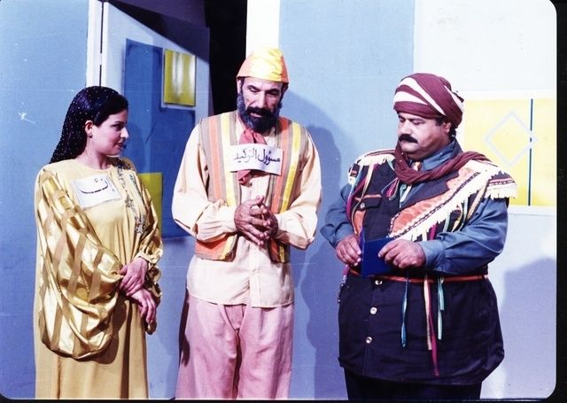 الفنانة عبير فريد و الفنان عبد الجبار الشرقاوي و الفنان محمود حسين في مشهد من مسلسل أشهى الموائد في مدينة القواعد المخرج عماد عبد الهادي المؤلف مالك المطلبي سنة 1999