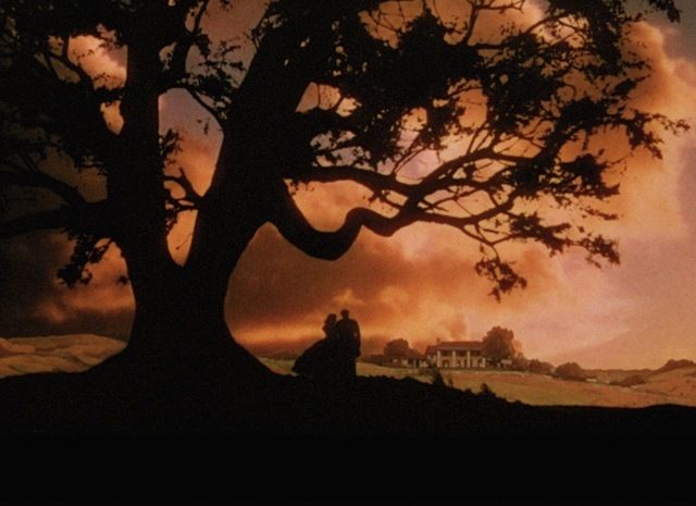 فيفيان لى مع والدها توماس ميتشيل ينظران وقت الغروب الى ارض تارا الحمراء، ويقنعها والدها ان الحب الحقيقى للأرض.