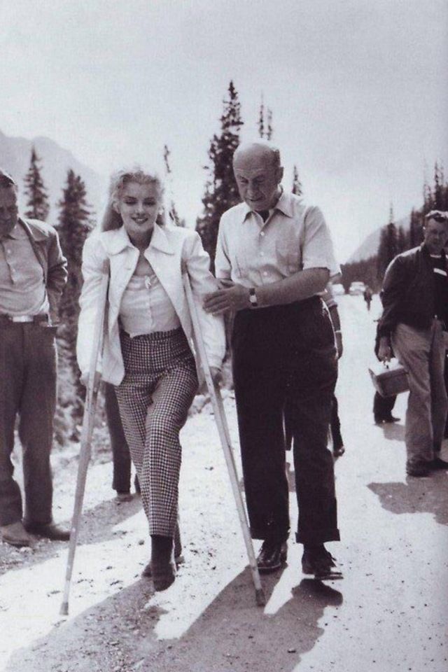 مارلين مونرو مع المخرج أوتو بريمينجر بعد إصابة قدمها والسير على عكازين.