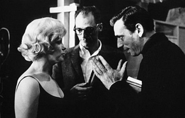 حديث بين مارلين مونرو وايف مونتان وارثر ميلر يستمع فى كواليس فيلم دعنا نحب ١٩٦٠.