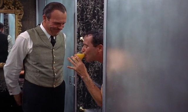 الأعزب جاك ليمون يتناول كوب عصير أثناء إستحمامه من مدير منزله تيرى توماس.