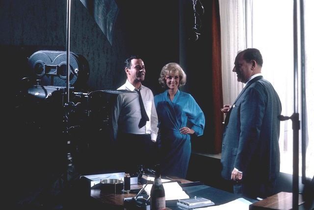 حديث باسم قبل تمثيل أحد المشاهد بين جاك ليمون و إيدى مايهوف وفيرنا ليزى تستمع.