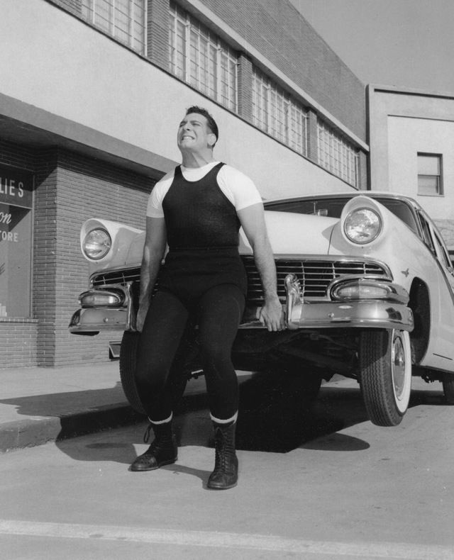 ميكى لان يتدرب برفع مقدمة سيارة.