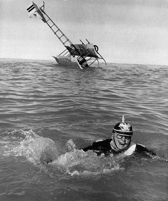 المتسابق الألمانى كولونيل مانفريد بعد ان سقطت طائرته فى الماء أثناء التجارب.