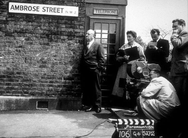 المخرج ألفريد هيتشكوك والمصور روبرت بوركس والمساعدين أثناء تنفيذ أحد مشاهد الفيلم.