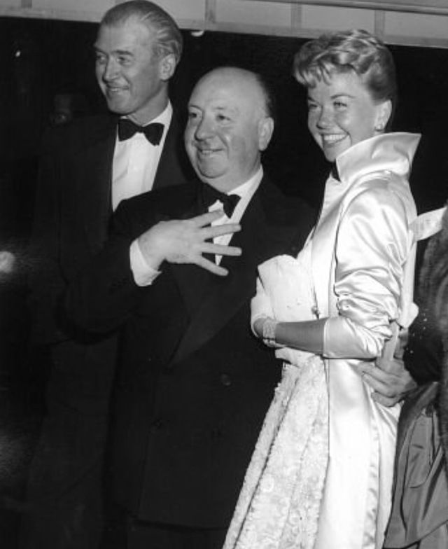الفريد هيتشكوك مع دوريس داى و جيمس ستيوارت فى العرض الأول للفيلم.