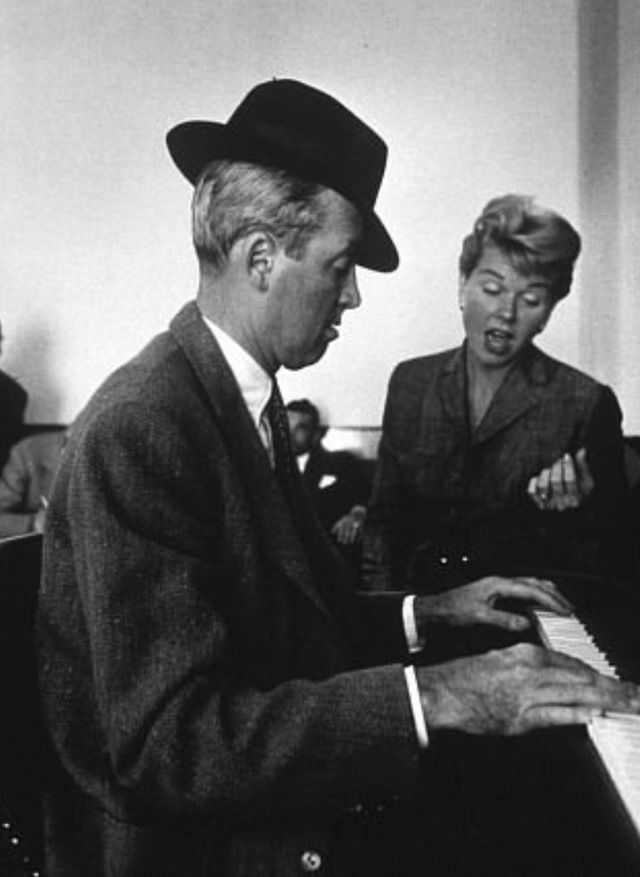 دوريس داى تتدرب على احد أغانى الفيلم وجيمس ستيوارت يعزف على البيانو.