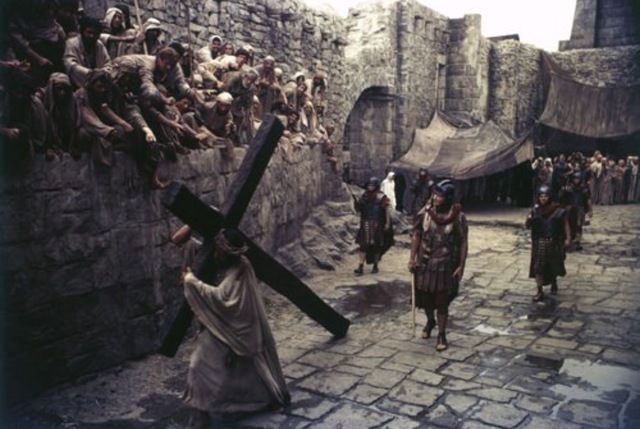 ماكس فون سيدو يحمل الصليب ويقوده جون واين الى مكان الصلب.