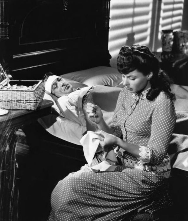 مشهد من فيلم Saratoga Trunk 1947 وفيه جارى كوبر مريضا وإنجريد بيرجمان تثبت زرار القميص.