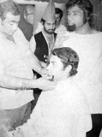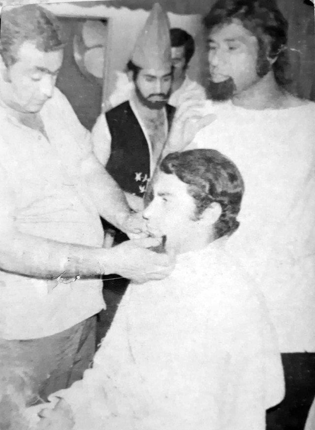 الماكير الراحل طه وهو يضع اللمسات الأخيره لماكياج الفنان عزيز جبر ويظهر معه في الصورة الراحل عزالدين طابو ،مسرحية مجالس التراث اخراج الراحل قاسم محمد ١٩٨٥م .