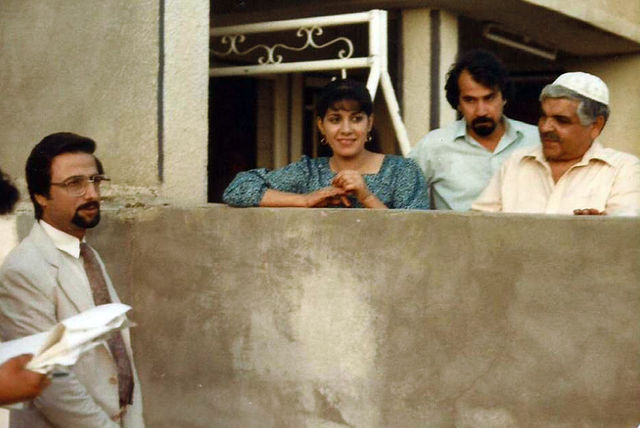 الفنانون : الراحل راسم الجميلي والمخرج حسن حسني وقاسم الملاك وهناء محمد اثناء تصوير مسلسل (الكذبة الاولى) .