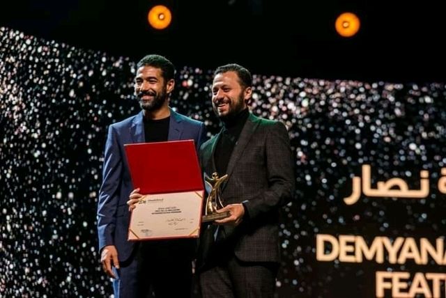أثنا استلام جائزة التانيت الذهبي من مهرجان قرطاج السينمائي سنة 2021