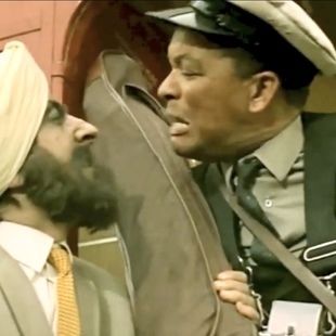 While roaming the streets of London, a man wearing sandwich boards encounters a variety of oddball people.