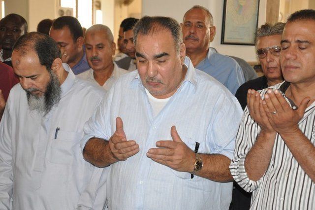 صورة تجمع الممثل سيد صادق وأشرف عبد الغفور وبعض الحضور في عزاء الفنان الراحل "عمر الحريري".