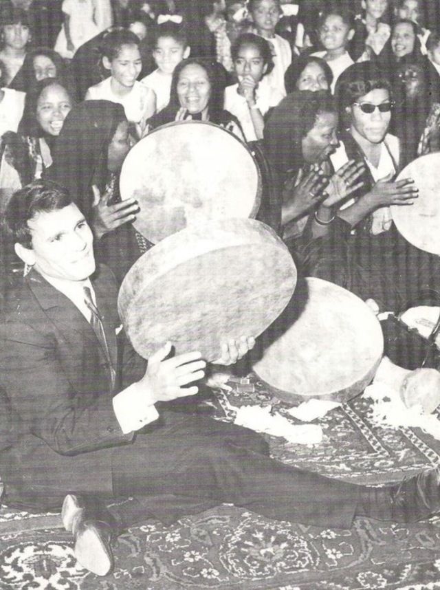 عبدالحليم حافظ يشارك فرقة عودة المهنا الضرب على الطار ( الدف ) خلال زيارته للكويت في احتفالات العيد الوطني الاول ١٩٦٢
