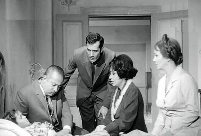 مشهد من فيلم "نحن لا نزرع الشوك" يجمع النجوم محمود ياسين، شادية، كوثر عسل، و حمدى يوسف الذى قام بدور الطبيب.