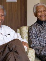 مورجان فريمان مع الثائر الجنوب أفريقي نيلسون مانديلا أثناء التحضير لفيلم Invictus عام 2009، والذي يقوم فيه "فريمان" بدور "مانديلا"