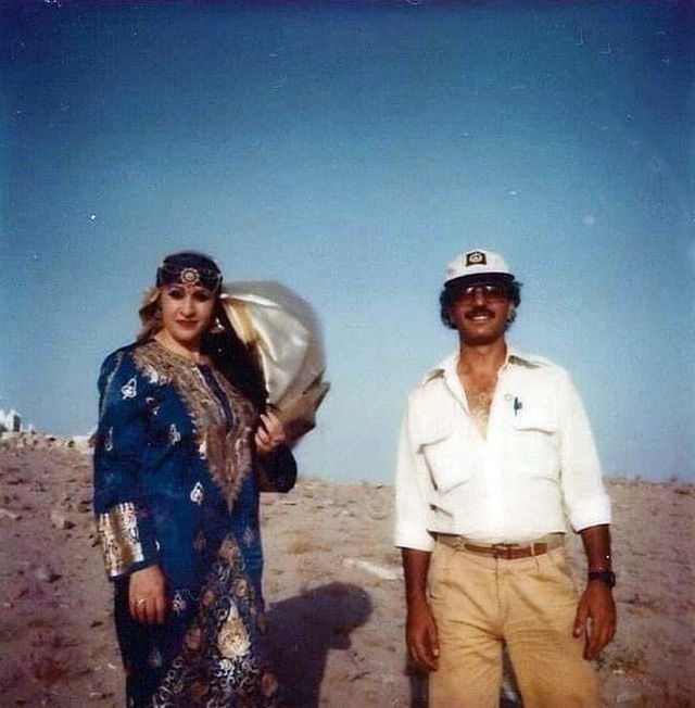 الفنانه الراحله مائدة نزهت مع المخرج فلاح زكي اثناء تصوير مشاهدها الغنائيه لمسلسل تاريخي 1980 صحراء الحبانية بمدينة الرمادي غرب العراق .