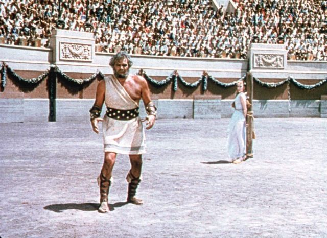 لقطة من فيلم Quo Vadis 1951. تم تقييد ديبورا كير واطلق عليها أسد جائع وبودى باير يواجه الأسد الذى لم يظهر فى اللقطة.