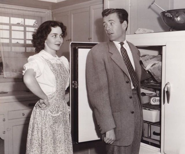 جينيفر جونز مع زوجها الاول روبرت ووكر فى منزل الزوجية مع ثلاجة الثلاثينيات.