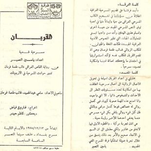 تأسست فرقة المسرح الفني الحديث في 3 أبريل 1952، على يد إبراهيم جلال، وبَنَت مسرحًا لها في مقر جمعية النداء الاجتماعي في منطقة الأعظمية آنذاك. قدمت الفرقة عددًا من المسرحيات...اقرأ المزيد العالمية، مثل (عطيل) لوليام شكسبير، و(المثري النبيل) و(الطبيب رغما عنه) لموليير، ثم انتقلت من تقديم مسرحيات عالمية إلى مسرحيات عراقية، مثل (الرهن) و(الباب القديم)، وكانت أول فرقة مسرحية خرجت بالمسرح إلى خارج العراق بمشاركات مسرحية رسمية وغير رسمية.