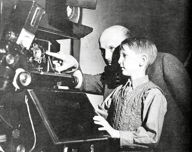 المخرج مايكل باول مع إبنه الممثل كولومبا باول فى كواليس تصوير فيلم Peeping Tom 1960.