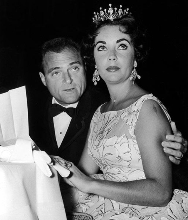 "اليزابيث تايلور" تجلس مع زوجها الثالث منتج الافلام "مايك تود"في حفل جوائز جولدن جلوب في ملهى ليلي "بستان جوز الهند" في هوليوود عام 1957.. وقد استمر زواجما من 1909 إلي 1958 حيث توفي "تود" في حادث تحطم طائرة .