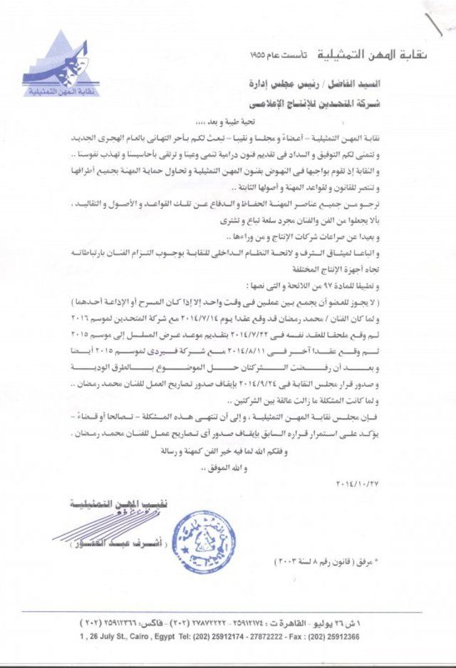 هذا وكانت شركة المتحدين للإنتاج الإعلامي قد لجأت لنقابة المهن التمثيلية بعدما أخل الفنان محمد رمضان بالعقد المبرم بينه وبين الشركة بتاريخ 22/7/2014 والذي يتضمن تقديم عمل درامي لموسم رمضان 2015، قبل أن يقوم الفنان محمد رمضان بتوقيع عقد آخر مع شركة فيردي بتاريخ 11/8/2014 لتقديم عمل آخر لنفس الموسم.