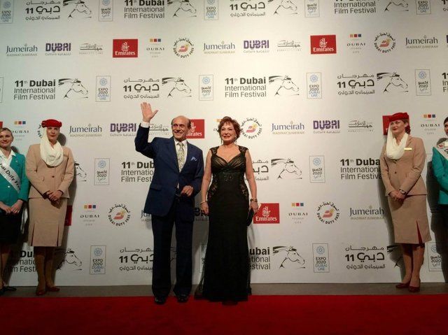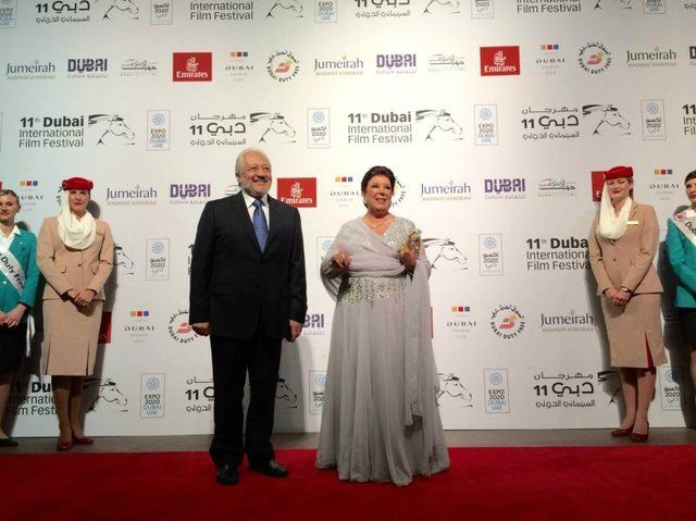 وتألق النجم نور الشريف وهو يخطو على السجادة الحمراء للحفل برفقة زميلته في بطولة الفيلم، النجمة ميرفت أمين، التي خطفت اﻷنظار بفستان أزرق طويل.