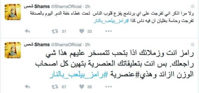 وأضافت: "رامز أنت وزملائك إذا بتحب تتمسخر عليهم هذا شي راجعلك. بس انت بتعليقاتك العنصرية بتهين كل أصحاب الوزن الزائد، وهذي عنصرية #رامز بيلعب بالنار".