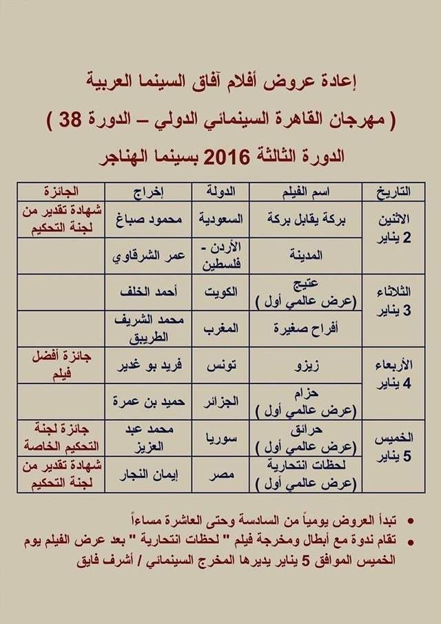تنطلق اليوم الاثنين في تمام السادسة مساءً عروض أفلام برنامج "آفاق السينما العربية"، التي عُرضت ضمن فعاليات الدورة الـ 38 من مهرجان القاهرة السينمائي الدولي.