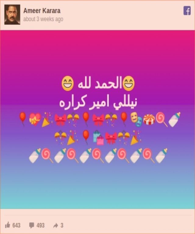 احتفل الفنان أمير كرارة بوصول مولودته "نيللي" في شهر ديسمبر 2017، ونشر على حسابه الشخصي بموقع الفيسبوك الخبر معلقا"نيللي أمير كرارة"