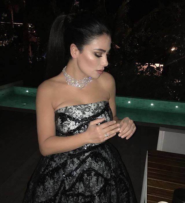 وخطفت صبا مبارك عدسات المصورين بفستان من الدانتيل المنقوش من الأسود والأبيض من تصميم "laith_maalouf "و مُرصع ببعض الفصوص الفضية دون أكمام.
