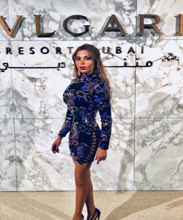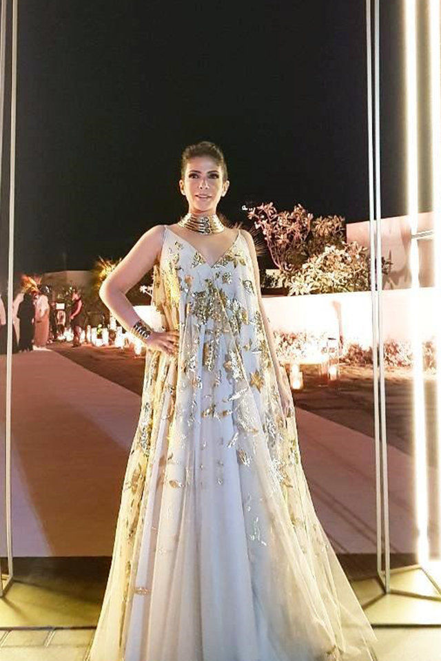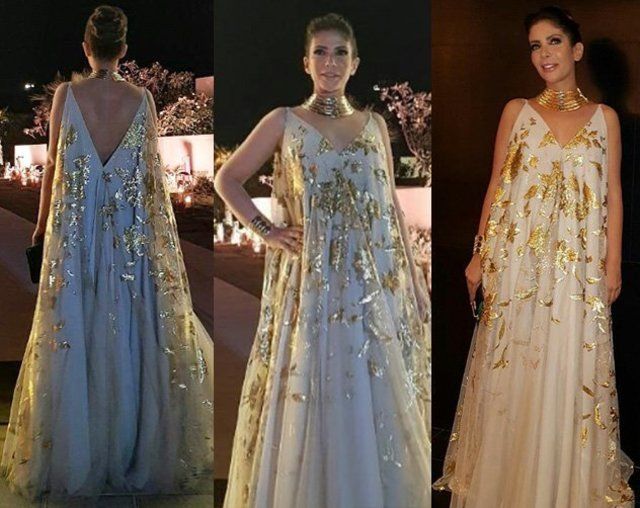 أما رزان مغربي فارتدت فستان قصير أزرق اللون مزين بتشجيرات ذهبية اللون من مجموعة لار بيجووتي