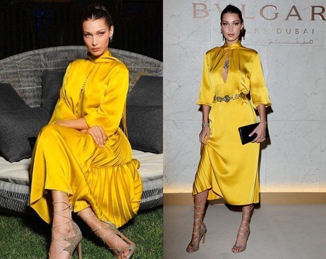 وسطعت الممثلة وعارضة الأزياء بيلا حديد بفستان أصفر من الستان لامع من دار فندي.
