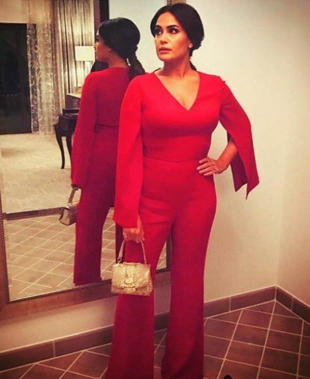 ولفتت هند صبري الأنظار بارتدائها جمبسوت أحمر من تصمميم داليا عياش