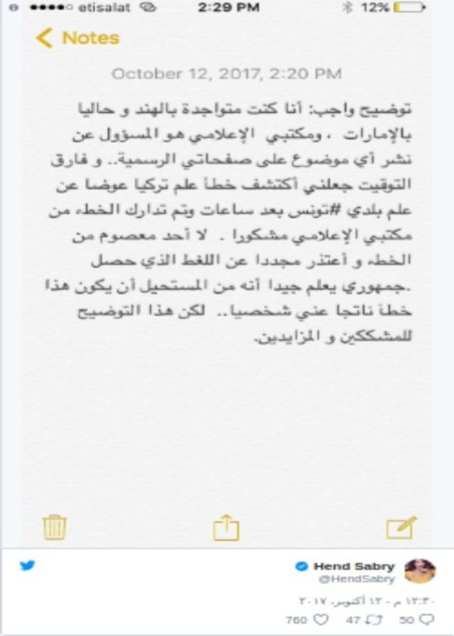 وحرصت هند على توضيح الأمر ونشرت عبر حسابها في موقع "تويتر" صورة كتابية اعتذرت فيها عما حدث وأوضحت ملابسات الخطأ الذي وقعت فيه.