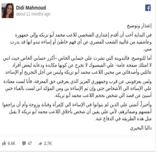 أعربت الممثلة المصرية داليا البحيري عن اعتذارها للاعب الكرة محمد أبو تريكة وكل جمهورها، بعد أن هاجمته بعنف عقب إدراج اسمه على قوائم الإرهاب. وقررت البحيري توجيه رسالة اعتذار عبر حسابها الشخصي على موقع "فيسبوك" للاعب المنتخب والنادي اﻷهلي، وكتبت قائلة "اعتذار وتوضيح.. في البداية أحب أن أقدم اعتذاري الشخصي للاعب محمد أبو تريكة وإلى جمهوره وعاشقيه من غالبية الشعب المصري عن أي فهم خاطئ أو إساءة تبدو أنها قد بدرت مني".
