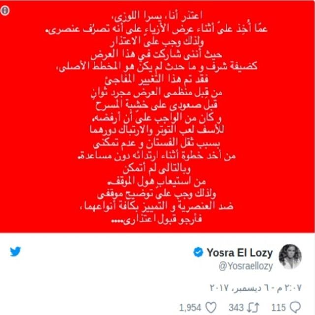 وكتبت يسرا عبر حسابها بموقع "تويتر"، فى بيان لها: "اعتذر أنا يسرا اللوزي عما أخذ علي أثناء عرض الأزياء على أنه تصرف عنصري.. لذلك وجب الاعتذار حيث أنني شاركت في هذا العرض كضيفة شرف وما حدث لم يكن هو المخطط الأصلي، فقد تم هذا التغيير المفاجئ من قِبل منظمي العرض مجرد ثوانِ قبل صعودى على خشبة المسرح، وكان من الواجب علي أن أرفضه".