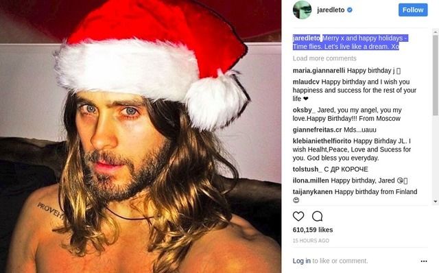 وبصورة كوميدية شارك النجم جاريد ليتو جمهوره احتفاله بالكريسماس، حيث نشر صورة على حسابه الرسمي بموقع إنستجرام مرتديًا قبعة بابا نويل، متمنيًا للجميع أعياد سعيدة.