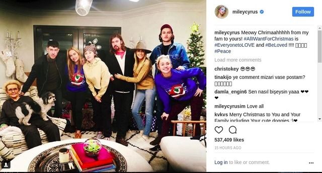 واحتفلت النجمة مايلي سايريس بعيد الميلاد مع عائلتها، ونشرت صورة تجمعها بهم على حسابها الرسمي بموقع إنستجرام.