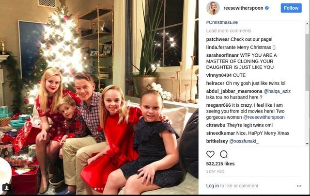 كما نشرت الممثلة الأمريكية ريس ويذرسبون على حسابها الرسمي بانستجرام صورة ﻷطفالها وعائلتها، أثناء احتفالهم بأعياد الكريسماس أمس.