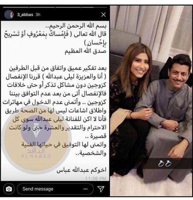 صدم جمهور الفنانة ليلى عبدالله عندما أعلنت عن خبر طلاقها من الفنان عبدالله عباس في يوم الحب، وبعد أقل من شهرين من عقد قرانهما وأعلن عبدالله عباس الخبر عبر صفحته بانستجرام ووجه رسالة إليها وإلى الجميع بعد اتخذاهما هذا القرار.