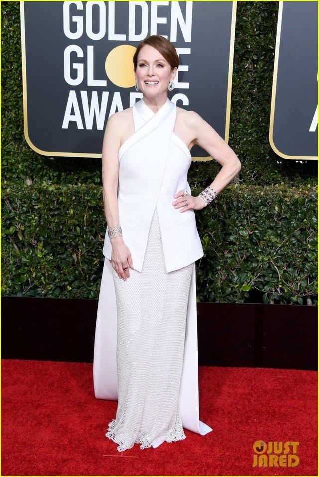 كما اختارت النجمة العالمية جوليان مور أن تتألق بارتدائها فستان باللون الأبيض من تصميم دار أزياء " Givenchy " وانتقت مجوهراتها من مجموعة " Chopard ".
