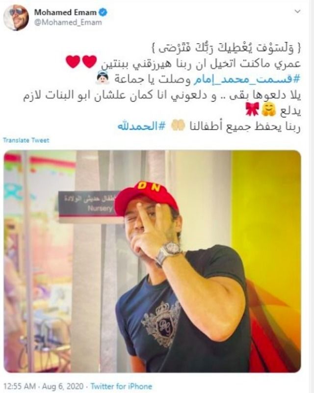 وكتب إمام، عبر حسابه بموقع تويتر:" وَلَسَوْفَ يُعْطِيكَ رَبُّكَ فَتَرْضَ "عمري ماكنت اتخيل إن ربنا هيرزقني ببنتين قسمت محمد إمام وصلت يا جماعة.. يلا دلعوها بقى .. و دلعوني أنا كمان علشان أبو البنات لازم يدلع .. ربنا يحفظ جميع أطفالنا".