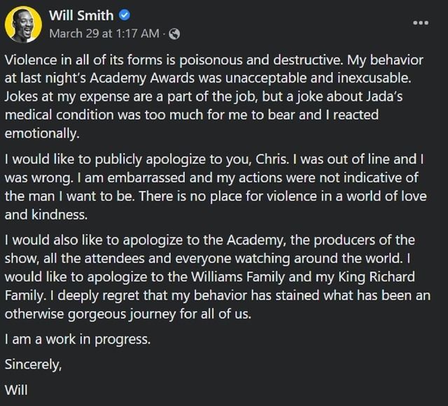 سميث أعلن على حسابه الرسمي بموقع التواصل الاجتماعي فيس بوك عن رفضة التام للعنف ورفضه لتصرفه الغير مقبول والذي لا يلتمس لنفسه أي أعذار تجاه ما فعله، ولكنه فقد القدرة على السيطرة على أعصابه بعد سخرية روك من مرض زوجته بداء الثعلبة وظهورها خلال الحفل حليقة الرأس، وأكد سميث عن شعوره بالخجل من تصرفه الصادم خلال الحفل واعتذر أيضا بشكل رسمي لأكاديمية فنون وعلوم الصورة المتحركة المسؤولة عن حفل أوسكار.