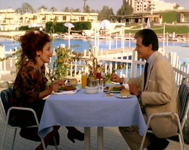 مشهد من فيلم القلب وما يعشق يضم سهير البابلي و صلاح قابيل وهم يتناولون الغداء على النيل