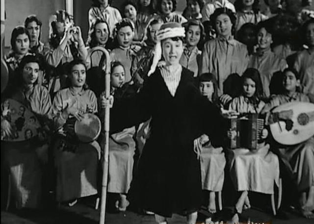 لبلبة تقلد الفنان عمر الجيزاوى فى مسرح الإصلاحية ووراءها الطفلة زيزى البدراوى تمسك بالدف، فى فيلم ٤ بنات وضابط عام ١٩٥٤.