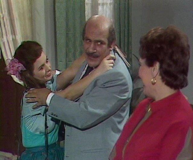 مشهد من مسلسل "حكايات هو وهي" يجمع بين سعاد حسني و حسن عابدين.